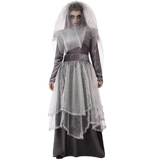 XL - 42/44 - Contenu : 1 voile, 1 robe, 1 ceinture.L'ensemble effrayant est composé de trois pièces : un voile gris en tulle, une ceinture grise et une robe incroyable en gris argenté à l'effet usée et vieillis par le temps. La robe est à manches longues, va quasiment jusqu'aux pieds et possède un c