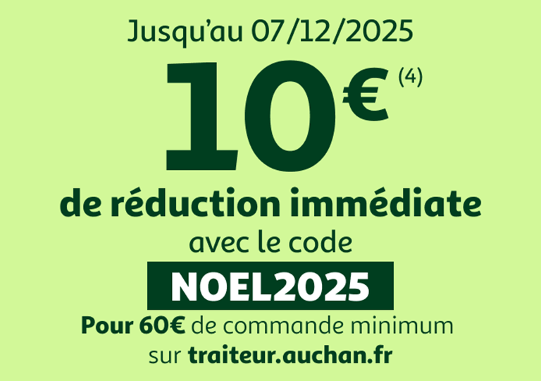 (4) 10€ de remise immédiate à partir de 60 euros de commande avec le code NOEL2025. Remise effectuée pour 60€ de commande minimum sur https://traiteur.auchan.fr. Valable pour toute commande passée entre le 26/11/2025 et le 07/12/2025 quelle que soit la date de retrait choisie. Non cumulable. Non valable en magasin. Exclusivement valable en saisissant le code NOEL2025 à l'étape "validation" de la commande. Une seule utilisation par client.
