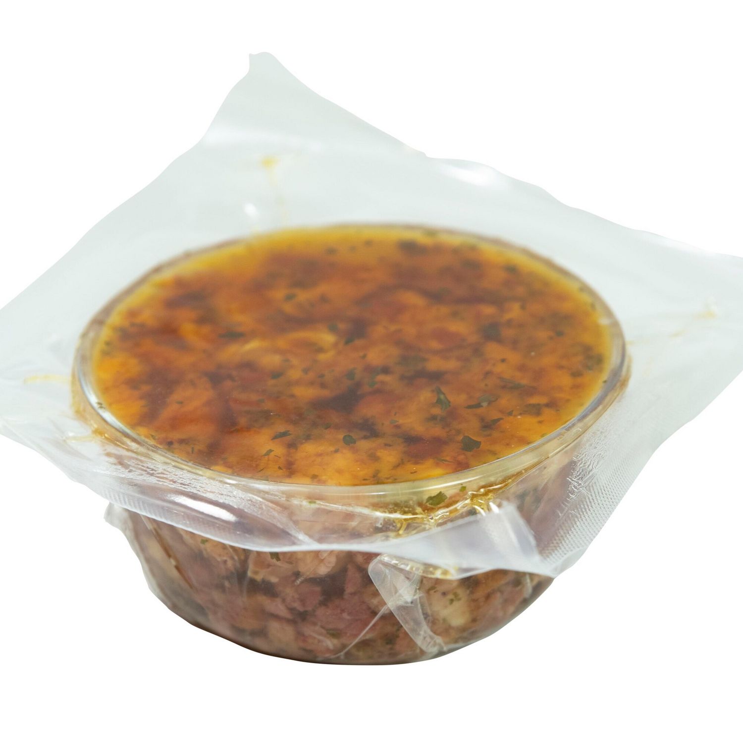 Préparation cuite en gelée avec des maigres de joues de porc et des carottes, aromatisé au Gris de Toul. A deguster accompagnée de crudités. Idée recette : servir en tranches assaisonnée de vinaigrette.