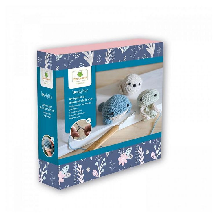 Retrouve dans ce magnifique coffret tout le nécessaire pour réaliser 3 Amigurumi animaux de la mer au crochet (1 baleine, 1 phoque, 1 méduse). Contenu: fil coton bleu 10 g, blanc 20 g, vert d'eau 10g, yeux en plastique 6x, 1 nez en plastique, aiguille large, garnissage, crochet 2,5 coton, crochet et un guide pas à pas pour de guider lors de tes créations.