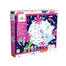 Fais briller ton imagination! Décore cinq tableaux autocollants avec les huit tubes de paillettes biodégradables inclus et crée des animaux fantastiques étincelants. Une activité sensorielle et féérique qui émerveille les enfants et stimule leur créativité. Contient : 5 tableaux (20 x 24 cm), 8 tube