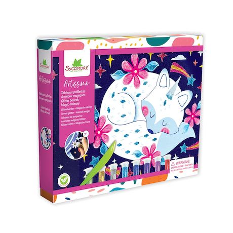 Fais briller ton imagination! Décore cinq tableaux autocollants avec les huit tubes de paillettes biodégradables inclus et crée des animaux fantastiques étincelants. Une activité sensorielle et féérique qui émerveille les enfants et stimule leur créativité. Contient : 5 tableaux (20 x 24 cm), 8 tubes de paillettes biodégradables, 1 spatule et un livret avec modèles.