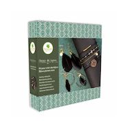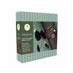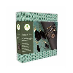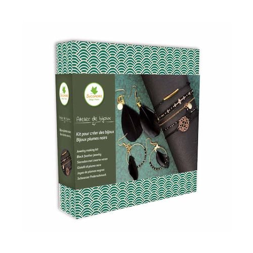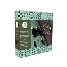 Dans cette jolie boîte réalise des magnifiques bijoux plumes pour des soirées chics. Cette boîte contient : boucles d'oreilles, chaîne, pendentifs dorés, perles japonaises (noir, or, gris acier), anneaux (x20pcs), aiguille, outil pour bijoux (coupe et pince), fermoirs, fils, pompon, tube or et 1 not
