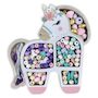 Contient des perles pastels pour créer des bijoux. Livré avec 3 mètres de fil dans un coffret en forme de licorne qui sert aussi de rangement.