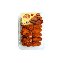 Ingrédients : Ailerons et manchons de poulet (origine France) 95%, sel et minéraux de mer (potassium, magnésium, calcium), épices et plantes aromatiques (dont paprika 0,9%), chapelure de BLE, acidifiants : citrate de potassium et acétate de calcium, arômes naturels. Traces d'autres céréales contenant du gluten, lait et oeuf.