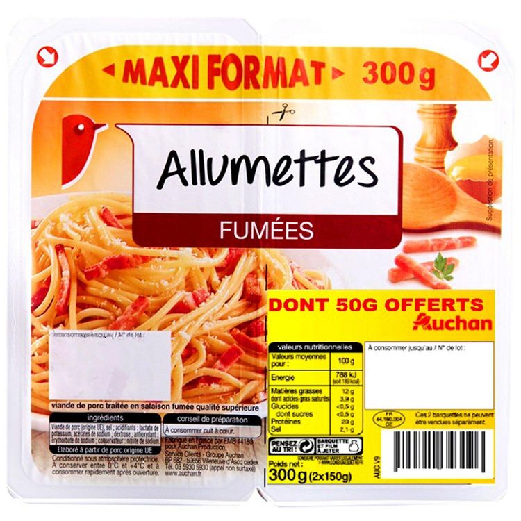 "Viande de porc de qualité supérieure finement tranchée et fumée au bois de hêtre. Ces allumettes sont idéales dans vos salades, pâtes ou omelettes. Elles sont aussi indispensables pour vos quiches et farces. Viande de Porc d'origine France (VPF)"