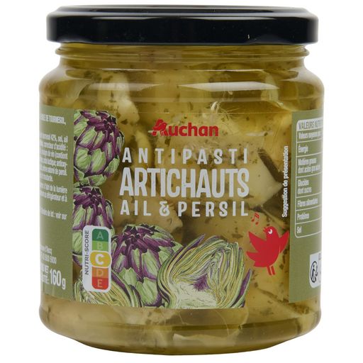 Ingrédients : artichauts 54%, huile de tournesol 42%, sel, ail préparé 0,6% (ail 0,59% (contient SULFITES), correcteur d'acidité: acide lactique), persil déshydraté 0,4%, vinaigre de vin (contient SULFITES), correcteurs d'acidité: acide citrique, acides lactique antioxydant: acide ascorbique arôme naturel d'ail, arôme naturel de persil. Traces éventuelles de céleri, poissons et moutarde.