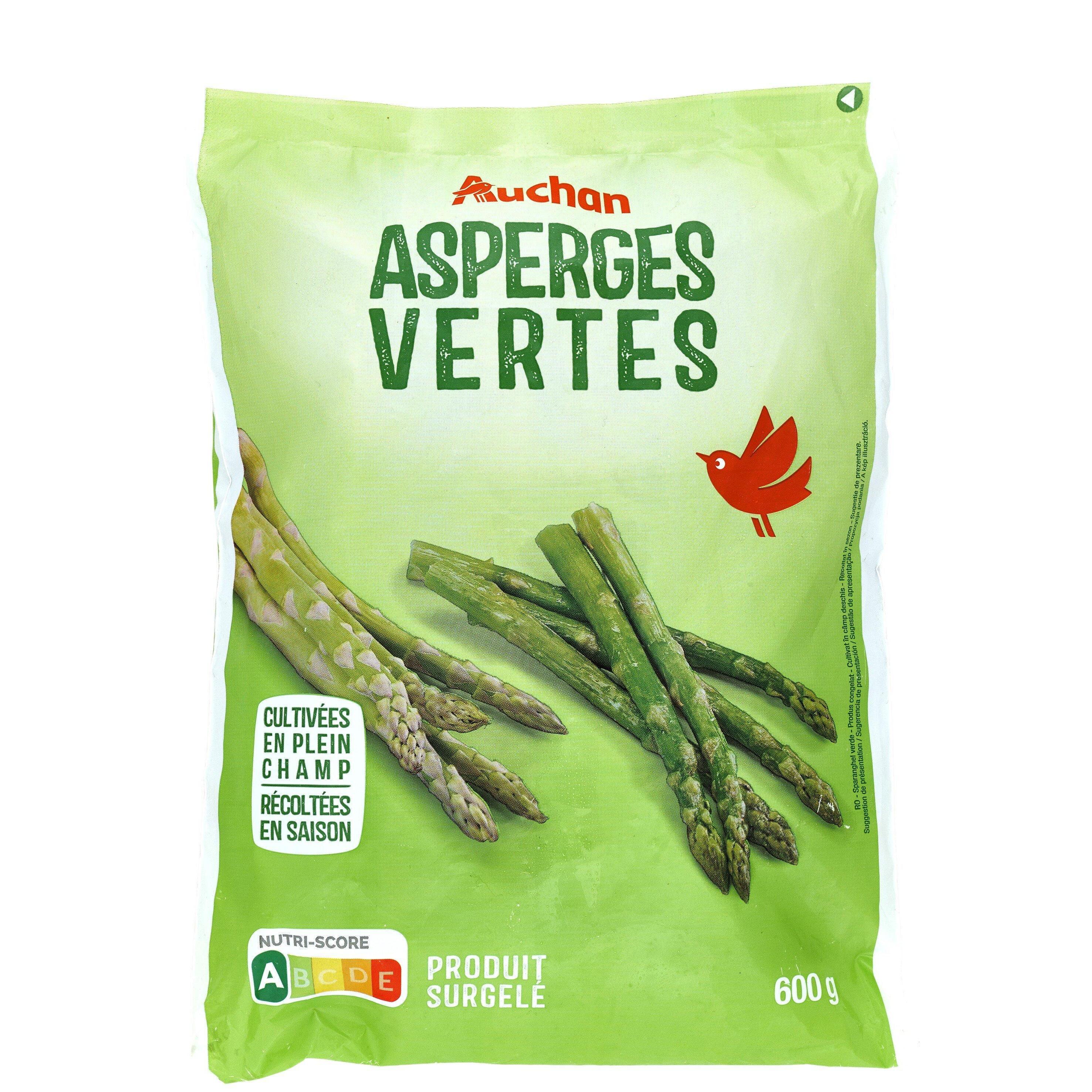 à la casserole:Sans décongélation préalablePlonger les asperges vertes dans l’eau bouillante salée et laisser cuire 8 à 10 minutes environ. Les plonger directement dans de l'eau froide pour conserver leur couleur..A l'autocuiseur:Sans décongélation préalableVerser les asperges vertes avec 2 verres d’eau dans l’autocuiseur et laisser cuire environ 3 minutes à partir de la rotation de la soupape.