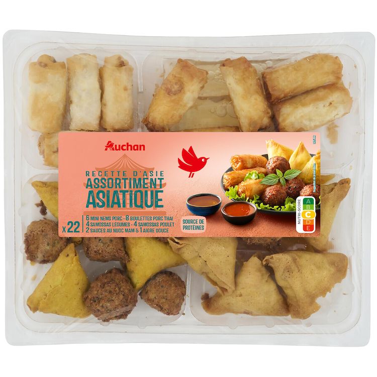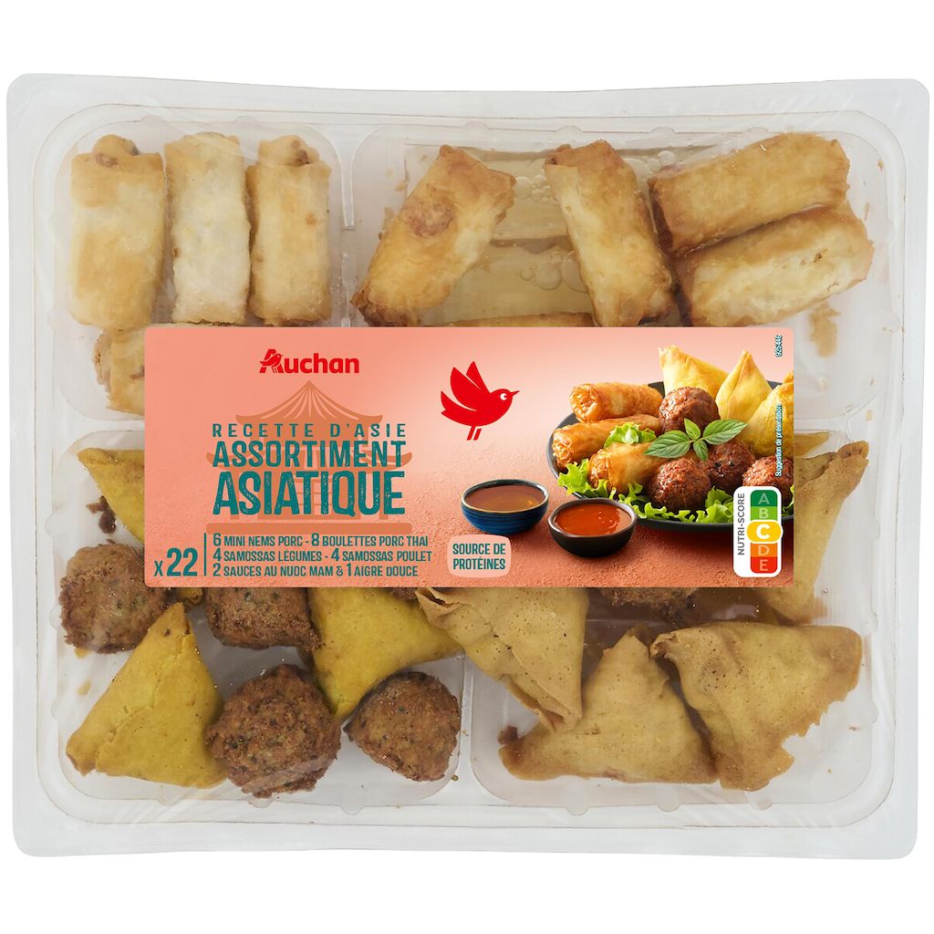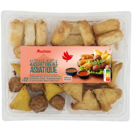 Ingrédients : Mini nems au porc (30%) : galette de riz 12.5% [eau, farine de riz, huile de tournesol, caramel (sucre, eau), sel], vermicelle de pois réhydraté, oignon, carotte, viande de porc 2,7% (origine : France), protéine de soja texturée, eau, gras de porc 0,5%, mix aromatique [sel, vinaigre de malt en poudre, maltodextrine de blé, épices (ail déshydraté, gingembre, cannelle, poivre noir, piment, curcuma), plantes aromatiques (coriandre, oignon en poudre), arômes], champignon noir réhydraté, amidon de maïs, sel.Boulettes porc Thaï (26.7%) : viande de porc 6.4%, eau, oignon, protéine de soja texturée, huile de tournesol, chapelure (farine de blé, sel), gras de porc 1.1%, fécule de manioc, basilic Thaï 0,6%, oeuf entier en poudre, ail, sel, huile de sésame, sucre, épices (cannelle, girofle, poivre, muscade), piment.Samossas au poulet (16,7%) : galette de blé 6.2% (eau, farine de blé, huile de tournesol, blanc d'oeuf en poudre, sel, curcuma, émulsifiant : lécithine de colza), oignon, eau, viande de poulet 2,1% (origine : France), carotte, protéine de soja texturée, chapelure (farine de blé, sel), huile de tournesol, curry (contient moutarde), ciboulette, ail, sel, amidon de maïs, curcuma.Samossas légumes (16,7%) : galette de blé 6.7% (eau, farine de blé, huile de tournesol, blanc d'oeuf en poudre, sel, émulsifiant : lécithine de colza), carotte 1.7%, pomme de terre, vermicelle de pois réhydraté, oignon, protéine de soja texturée, chou de Milan 0.7%, ciboule, courgette 0.6%, champignon noir réhydraté, fécule de manioc, sauce soja (eau, graines de soja, farine de blé, sel), coriandre, ail, oignon déshydraté, oeuf entier en poudre, huile de sésame, sel, gingembre.Sauce nuoc-mâm (6,7%) : eau, sucre, nuoc-mâm 0,9% (poisson, sel, eau), vinaigre, sel.Sauce aigre douce (3.2%) : eau, sucre, vinaigre d’alcool, ananas, poivron rouge, amidon modifié de maïs, huile de tournesol, sel, acidifiant : acide citrique épices (curry, gingembre), épaississants : gomme guar, gomme xanthane.Pourcentages exprimés sur le total de la recette.Traces éventuelles de crustacés, lait et fruits à coque.