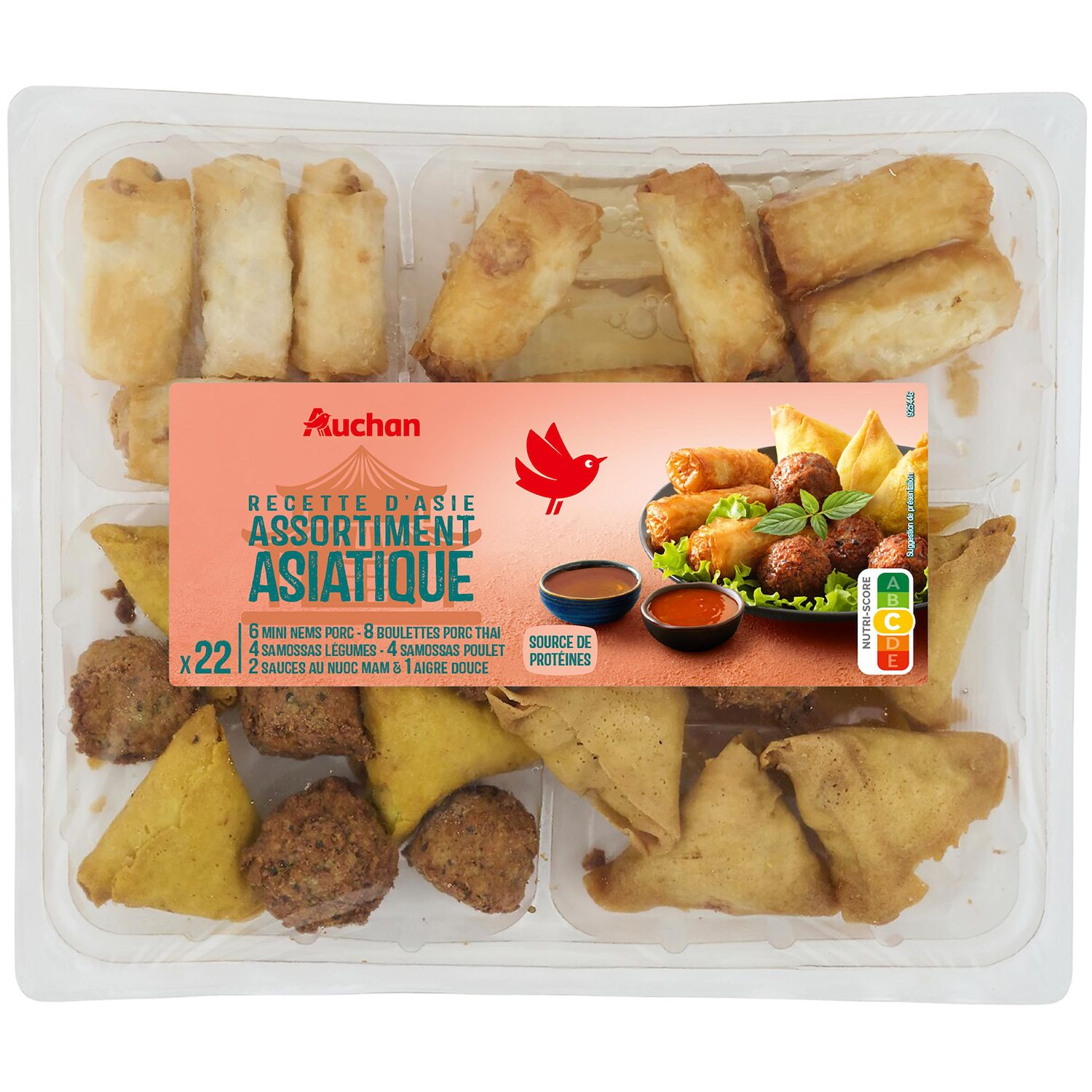 Assortiment composé de 6 mini nems porc, 8 boulettes porc thaï, 4 samossa poulet, 4 samossa legumes . Avec sauces nuoc mam et aigre douce