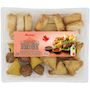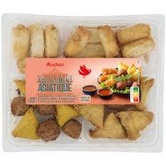 Assortiment asiatique de 6 nems au porc, 8 boulettes au porc Thaï, 4 samossas au poulet, 4 samossas aux légumes avec sauces nuoc-mâm et aigre douce.