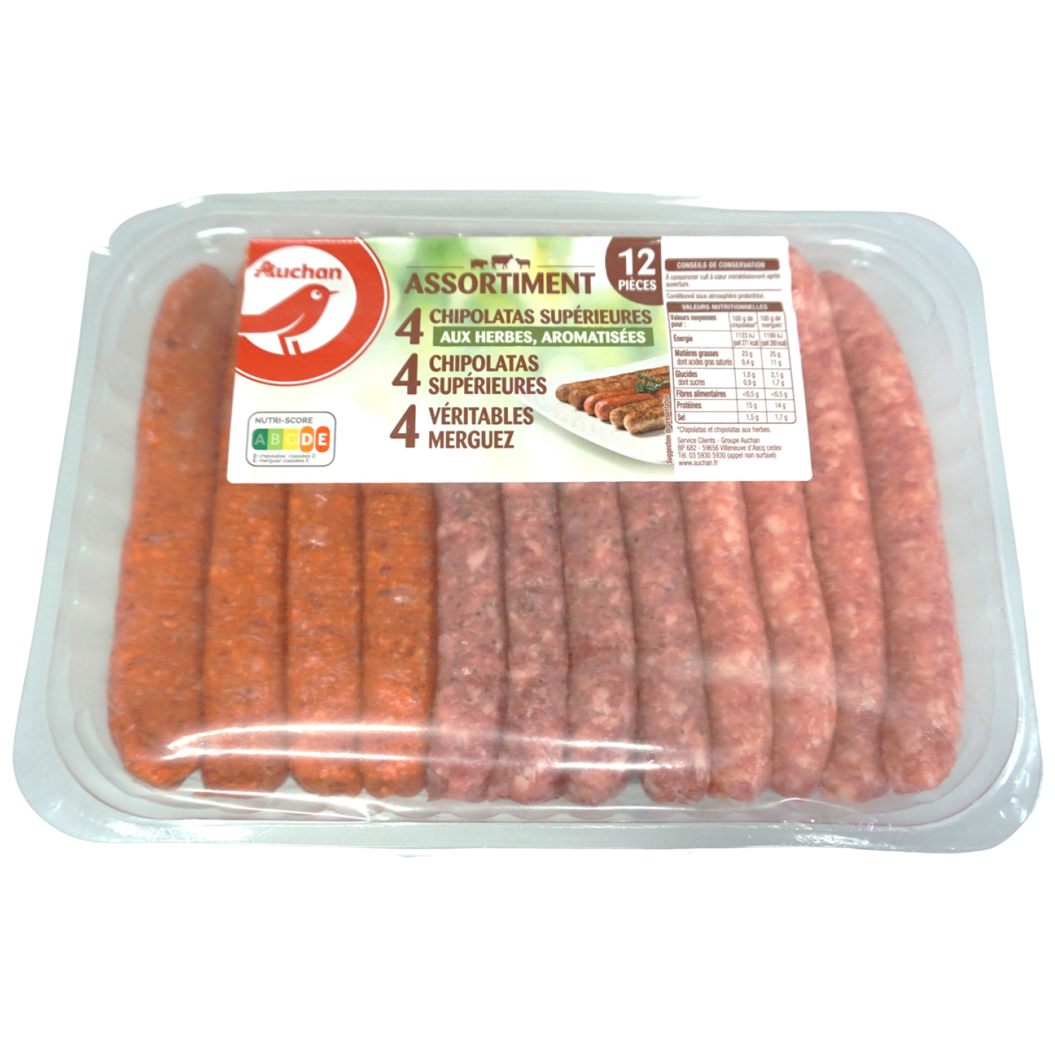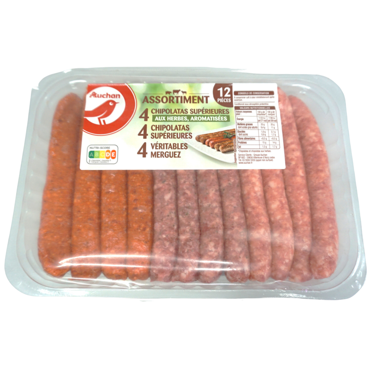 Saucisses et saucisses aux herbes à base de chair pur porc , poussées sous boyau naturel de mouton. erguez à base de viande de boeuf et de mouton, caractérisées par un assaisonnement à base de piment, et poussées sous boyau naturel de mouton. Auchan chipolata x4 + merguez x4 + chipo aux herbes x4 -660g