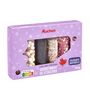 Ingrédients : Lentilles colorées : Sucre 63.4%, Poudre de lait entier, Beurre de cacao, Farine de blé, Masse de cacao, Amidon de BLÉ, Amidon transformé de maïs, Denrées alimentaires colorantes : Concentré de pomme, concentré de citron, concentré de carthame, concentré de radis, concentré de spiruline, concentré de patate douce, Sirop de glucose, agents d'enrobage : cire de carnauba, Shellac Epaississant : gomme arabique, Sel, Jus concentré de betterave rouge, Emulsifiants : Lécithines de tournesol et/ou de colza, Huiles végétales (noix de coco, colza). Billes colorées : Sucre 88.3%, Farine de riz, Sirop de glucose, Denrées alimentaires colorantes : concentré de pomme, concentré de cassis, concentré de citron, concentré de radis, sel, huiles végétales (noix de coco/colza), agent d'enrobage : cire d'abeille blanche et jaune. Vermicelles chocolat : Sucre 87.1%, Poudre de cacao maigre, Sirop de glucose, Huile végétale (noix de coco, colza), Emulsifiants : Lécithines de tournesol et/ou colza. Vermicelles multicolores : Sucre 93.8%, Sirop de glucose, Amidon de maïs, huile végétale (noix de coco, colza), Denrées alimentaires colorants concentrée de pomme, concentré de cassis, concentré de citron, concentré de radis, concentré de carthame, concentré de spiruline) Jus concentré de betterave rouge , Emulsifiants : Lécithines de tournesol et/ou de colza, Agent d'enrobage : cire de carnauba, Acidifiant : Acide citrique. Bâtonnet rouge et blanc : Sucre 92,6%, Sirop de glucose, Sirop de sucre inverti, Amidon de maïs, Huile végétale (noix de coco, colza), Denrées alimentaires colorantes concentré de pomme, concentré de citron, concentré de radis, concentré de carthame, concentré de patate douce, dextrose, Acidifiant : acide citrique, Emulsifiant : Lécithines tournesol et/ou colza. Microbilles Multicolores : Sucre 76.7%, Amidon (BLÉ , maïs), Sirop de glucose, Denrées alimentaires colorantes concentré de pomme, concentré de cassis, concentré de citron, concentré de radis, concentré de carthame, concentré de spiruline, Jus concentré de betterave rouge, Huile végétale (noix de coco, colza), Agent d'enrobage : cire d'abeille blanche et jaune, cire de carnauba. Traces éventuelles de fruits à coque et de soja.