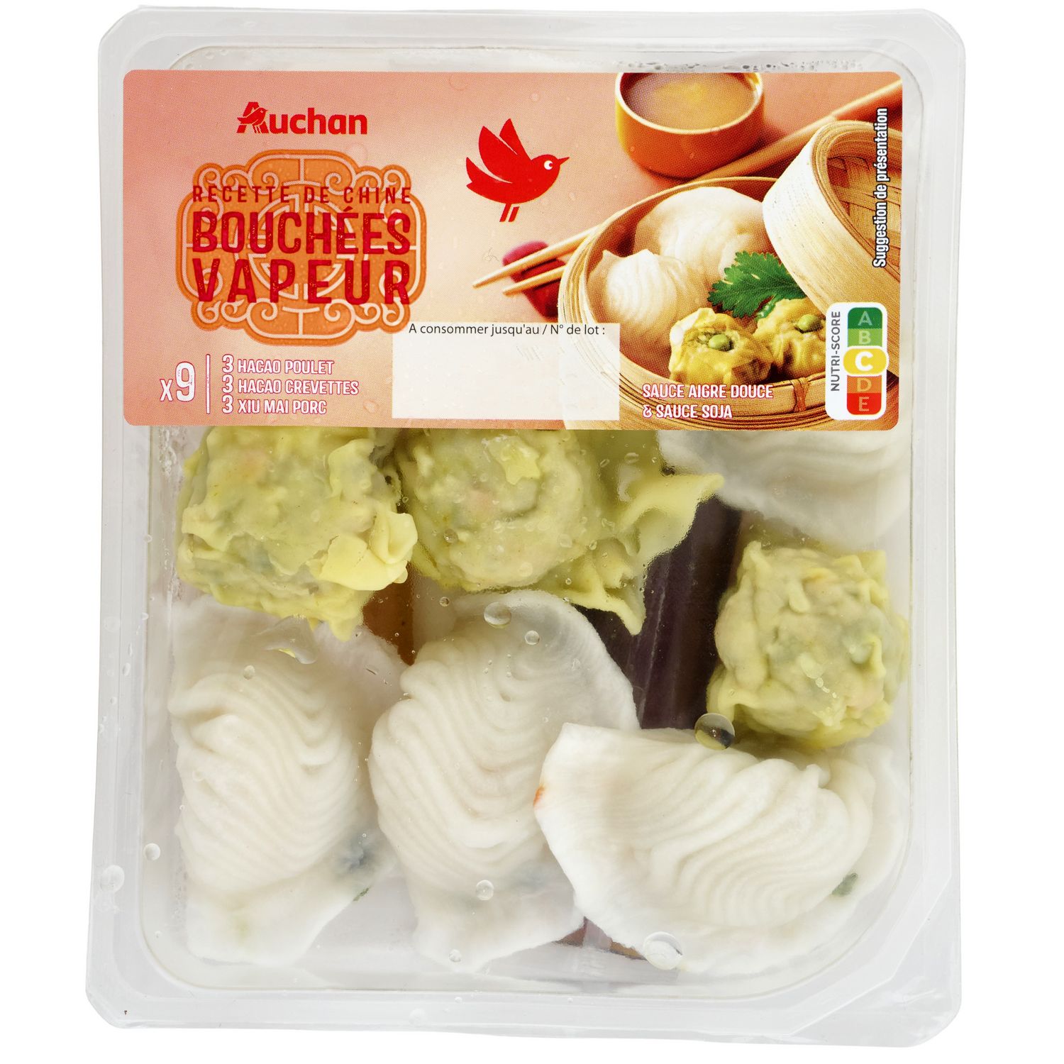 Ingrédients : Hacao poulet (27,3%) : eau, viande de poulet 5%, fécule de manioc, amidon de BLÉ, oignon, protéine de SOJA réhydratée (farine de SOJA, eau), chou de Milan, ciboule, huile de SÉSAME, châtaigne d'eau, peau de poulet rôtie et gras 0,4% (peau de poulet, miel), purée de gingembre, sauce SOJA (eau, graine de SOJA, sel, farine de BLÉ), persil 0,2%, huile de tournesol, sel, ail en poudre. Hacao crevette (27,3%) : eau, CREVETTE décortiquée 4,3% (CREVETTE, sel, conservateur : DISULFITE de sodium), fécule de manioc, amidon de BLÉ, vermicelle de pois réhydraté (eau, vermicelle de pois), ciboule, carotte, châtaigne d'eau, oignon, blanc d'OEUF en poudre, chapelure (farine de BLÉ, sel), huile de tournesol, sel, citronnelle, fibre de bambou, huile de SÉSAME, sucre, poivre. Xiu mai porc (27,3%) : viande de porc 6,2%, farine de BLÉ, vermicelle de pois réhydraté (eau, vermicelle de pois), oignon, carotte, petit pois, champignon émincé cuit (champignon, eau, sel, acidifiant : acide citrique antioxydant : acide ascorbique), gras de porc 1%, fécule de manioc, chapelure (farine de BLÉ, sel), coriandre 0,5%, farine de SOJA texturée, blanc d'OEUF en poudre, purée d'ail, sel, GLUTEN de BLÉ, poivre, curcuma. Sauce aigre-douce (9%) : eau, sucre, vinaigre d'alcool, ananas, poivron rouge, amidon modifié de maïs, huile de tournesol, sel, acidifiant : acide citrique épices, gingembre, épaississants : gomme guar, gomme xanthane. Sauce soja (9%) : eau, sauce SOJA 3% (eau, graines de SOJA, sel, farine de BLÉ), sucre, jus de citron concentré, épaississants : gomme guar, gomme xanthane. Traces éventuelles de poissons, lait, mollusques, moutarde et céleri. Elaboré à partir de poulet et porc origine UE. Pourcentages exprimés sur le total de la recette.