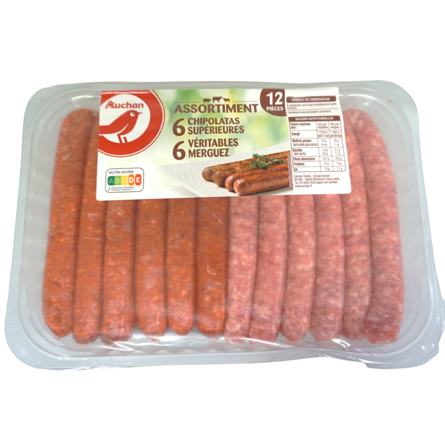 Chipolatas à base de chair pur porc , poussées sous boyau naturel de mouton. Véritables merguez à base de viande de boeuf et de mouton, caractérisées par un assaisonnement à base de piment, et poussées sous boyau naturel de mouton. Auchan chipolatas x6 + merguez x6 -660g