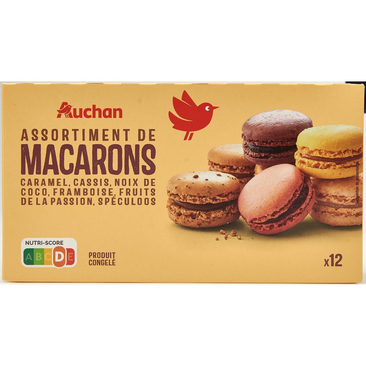 2 Macarons au caramel au beurre et au sel, 2 Macarons au cassis, 2 Macarons noix de coco, 2 Macarons à la framboise, 2 Macarons aux fruits de la passion, 2 Macarons au spéculoos, congelés