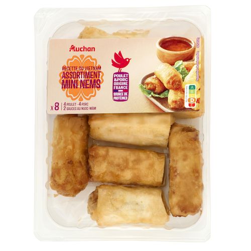 4 mini nems de porc et 4 mini nems de volaille avec 1 sachet de sauce à réchauffer au four et à partager à l'apéro