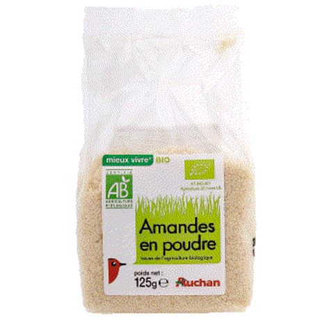 Amandes (FRUITS A COQUE) en poudre sans peau biologiques.  Traces éventuelles d'arachide, d'autres fruits à coque, de graines de sésame, de gluten, de sulfites et de soja.