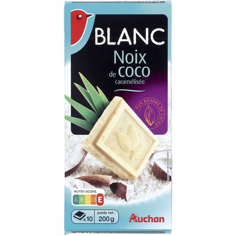 Chocolat blanc à la noix de coco râpée caramélisée 20%.