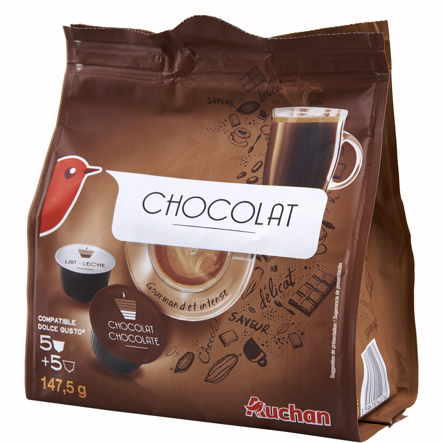 (capsule de chocolat): chocolat en poudre 99,9% (sucre, cacao), arôme (capsule de lait): lait entier en poudre, sucre (10%), anti-agglomérant: dioxyde de silicium, émulsifiant: (lécithine de soja ) Traces éventuelles de gluten