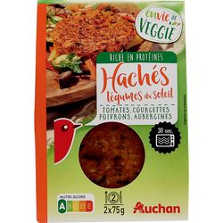 Légumes mi-séchés et grillés 50.1% (tomates mi-séchées 18.6%, courgettes grillées 18.6%, poivrons grillés 6.6%, aubergines grillées 6.2%), protéines de pois réhydratées 31.7%, concentré de tomates, fécule de pomme de terre, huile de colza, fibre de pois, sel, ail, thym, origan. Pourcentages exprimés sur le total de la recette.
