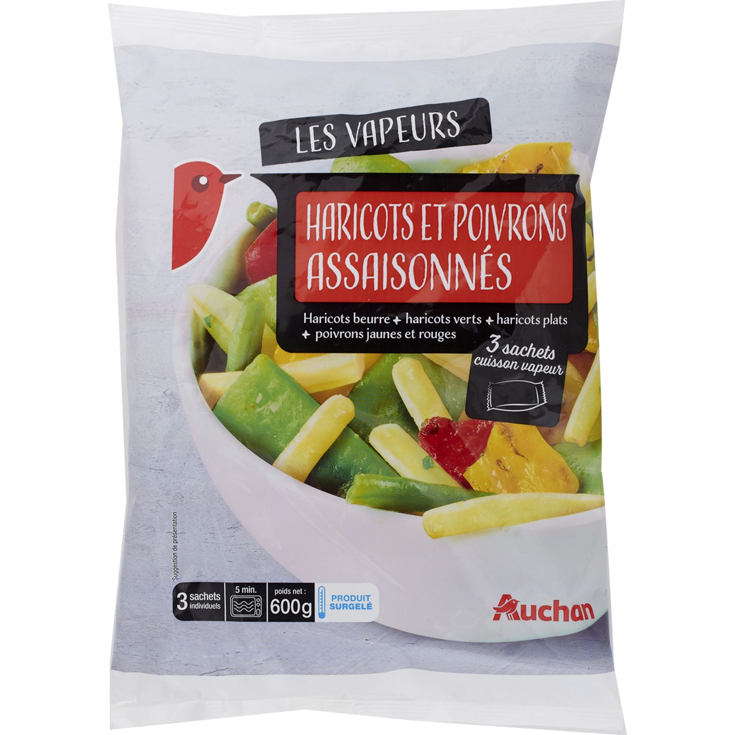 Haricots beurre 39%, haricots verts 20%, haricots plats 16%, poivrons rouges et jaunes grillés 15%, eau, huile d'olive vierge extra, beurre concentré (contient lait ), sel, arôme naturel (contient lait et céleri ), persil, thym, arôme naturel de poivre, épaississant : gomme xanthane. Traces éventuelles de gluten, oeufs, poissons, crustacés, moutarde.