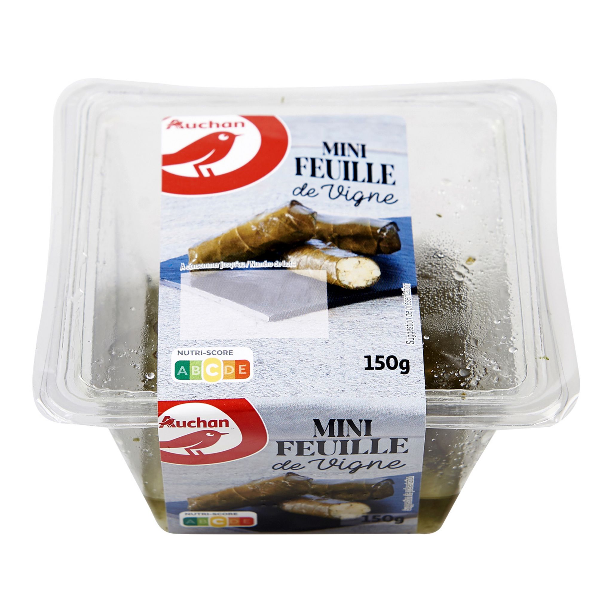 Mini feuille de vigne farcie au riz 80% (riz, eau, feuille de vigne 8%, oignon, huile de soja, sel, aneth, menthe, poivre noir, acidifiant : acide citrique), huile végétale (colza, olive), persil 0,35%, baies roses. Pourcentages exprimés sur le total de la recette