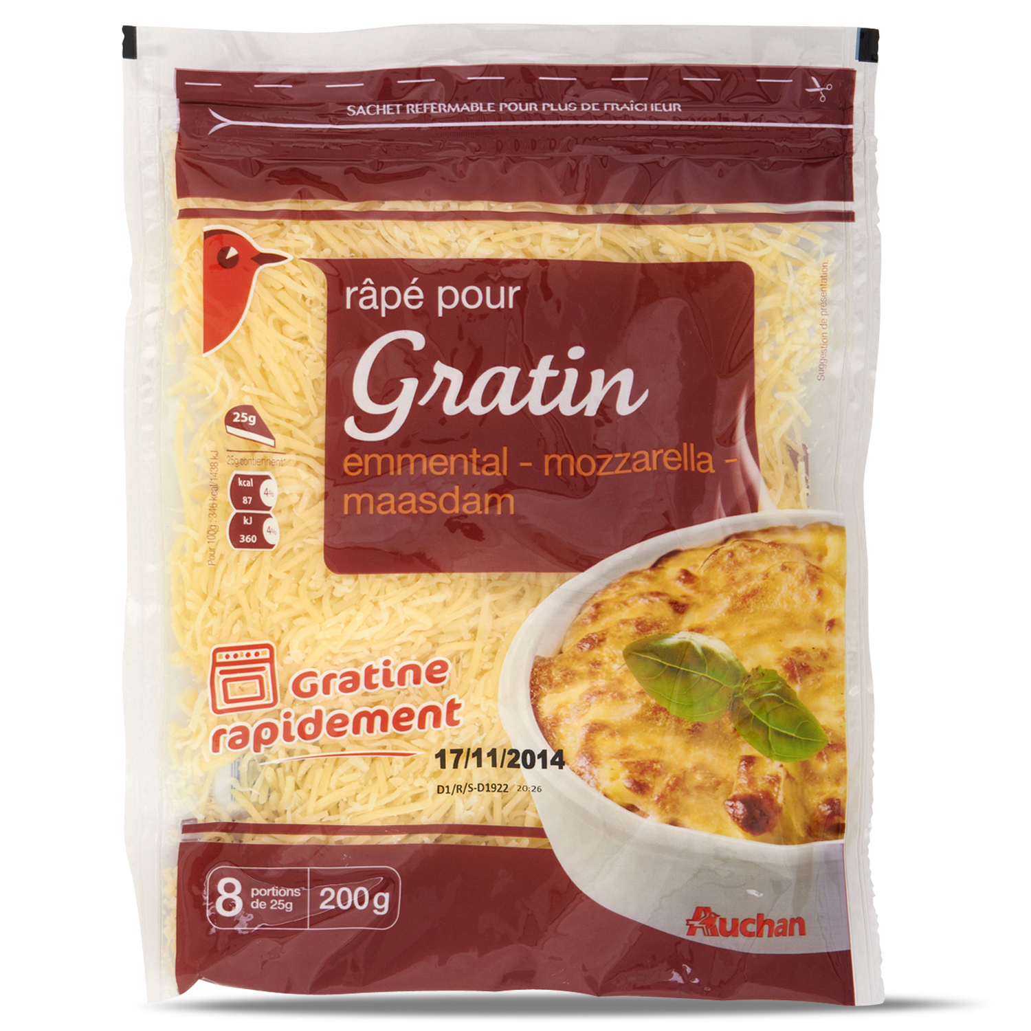 emmental 33% : lait pasteurisé de vache (origine France), sel, ferments lactiques, coagulant ; mozzarella 33% : lait  pasteurisé de vache (origine UE), sel, ferments lactiques, coagulant ; maasdam - fromage à pâte pressée non cuite 32% : lait pasteurisé de vache (origine France), sel, ferments lactiques, colorant : rocou, coagulant ; anti-agglomérant : fécule de pomme de terre 2%.
