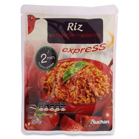 Riz long étuvé précuit (78.5%), poivrons rouges, purée de tomates (5.7%), oignon, huile d’olive (2.3%), sel, plantes aromatiques (0.9%), arôme (contient lait ), exhausteur de goût : glutamate de sodium, ail, colorant : extrait de paprika, acidifiant : acide citrique.