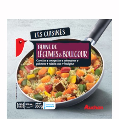 Légumes en dés (55,5%) (carottes, courgettes, oignons, poivrons jaunes, poivrons rouges grillés), sauce (eau, huile olive extra vierge, arôme naturel, concentré de tomates, ail, basilic, assaisonnement (poudre d'ail, sel, poudre d'origan, poudre de cumin, poudre de coriandre, poudre de romarin, poivre blanc), oignon jaune grillé), aubergines préfrites (10,5%) (aubergines et huile de tournesol), boulgour (5%) (blé (contient gluten )dur précuit), raisins secs (4%) (raisin, huile de colza et/ou graine de coton et/ou tournesol). Traces éventuelles de noix, céleri, crustacés, mollusques, grains de sésame, lait, sulfite, moutarde et oeufs.