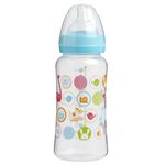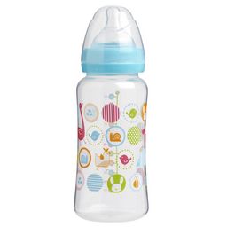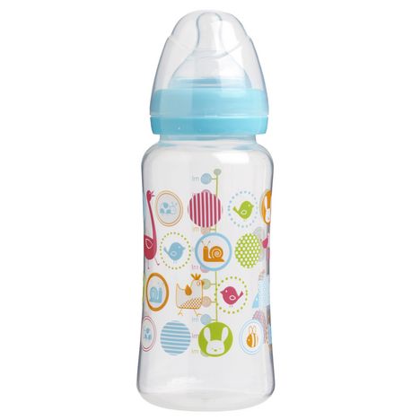 Biberon large incassable en polypropylène de 360ml de contenance. Le capuchon est anti-fuite, la tétine est à bout rond et en silicone.