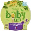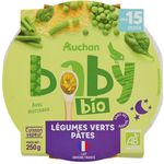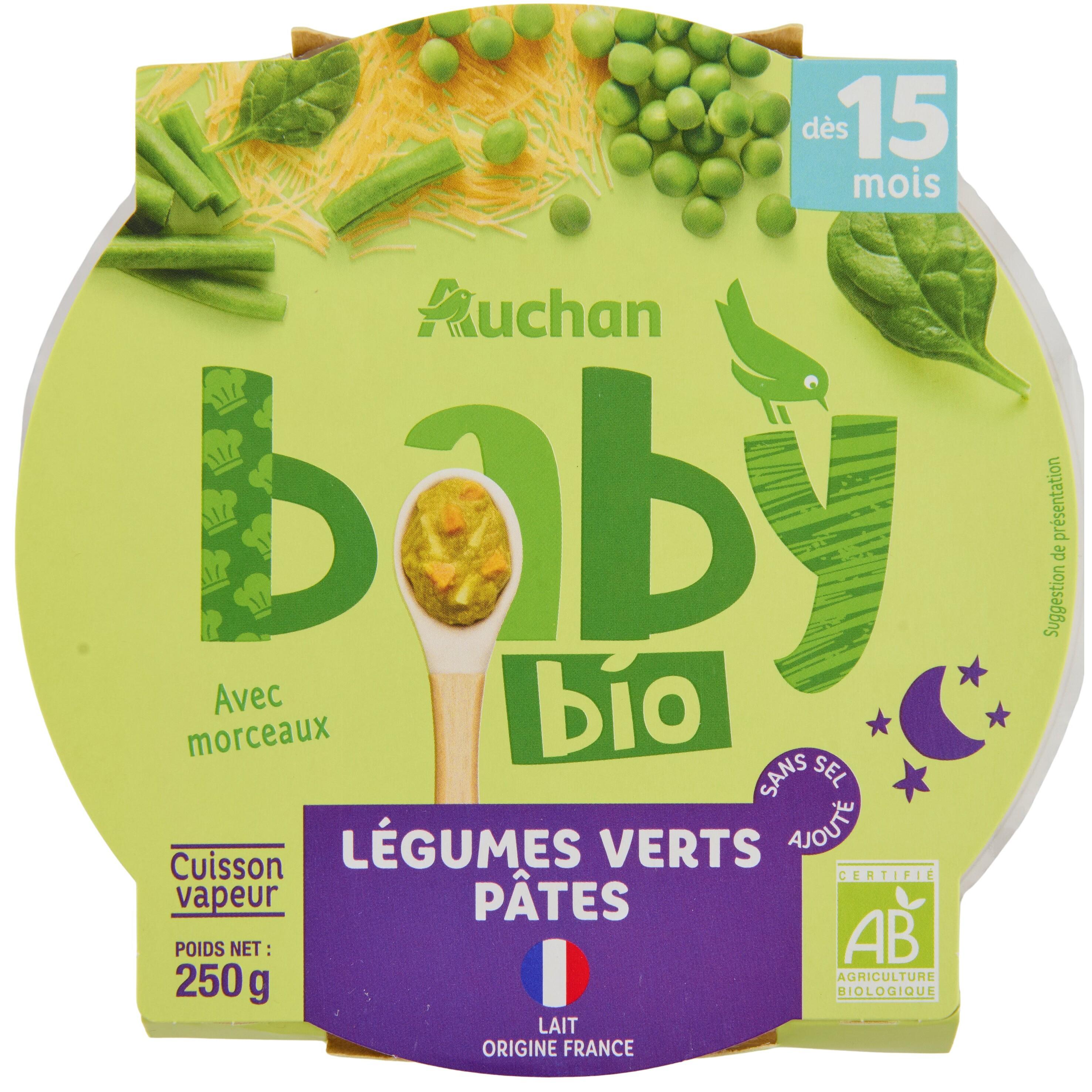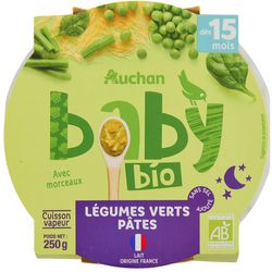 Aliment pour bébé - dès 15 mois - Purée à base de lait entier reconstitué, petits pois, pâtes cuites, épinards et haricots verts bioFabrication et distribution certifiées par Ecocert FR-BIO-01
