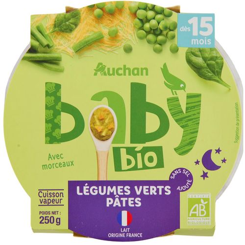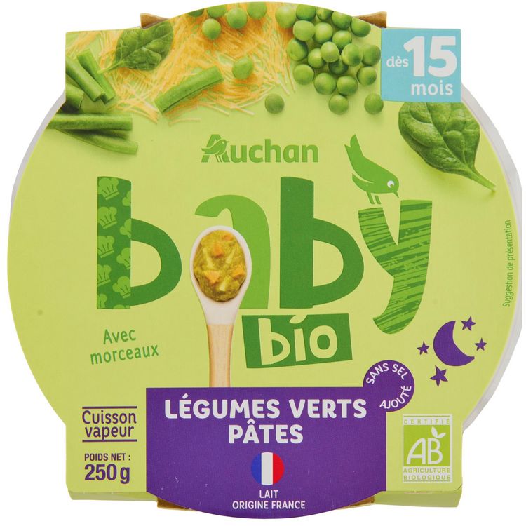 Les recettes de la gamme AUCHAN BABY ont été élaborées en collaboration avec des professionnels de la nutrition infantile. Lait origine France.sans sel ajoutésavec morceaux