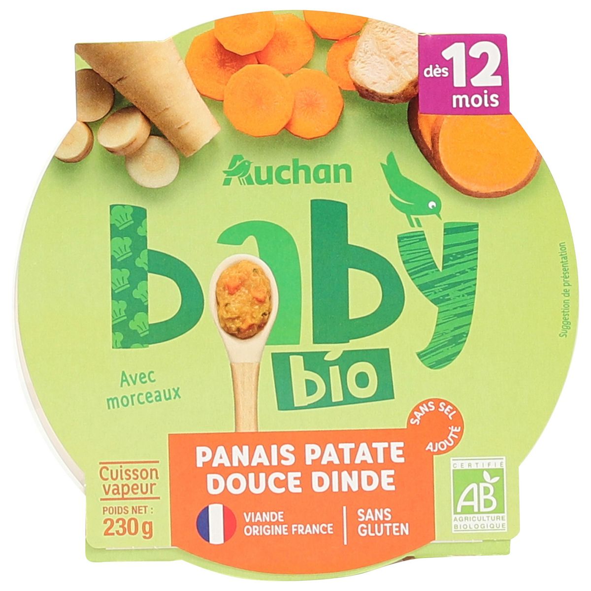 Les recettes de la gamme AUCHAN BABY ont été élaborées en collaboration avec des professionnels de la nutrition infantile.sans sel ajoutéssans glutenavec morceaux