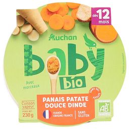 Aliment pour bébé - dès 12 mois - Purée à base de panais, patate douce et viande de dinde bioFabrication et distribution certifiées par Ecocert FR-BIO-01