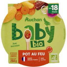 Aliment pour bébé - dès 18 mois - Purée à base de pomme de terre, carotte, viande de boeuf et poireau bioFabrication et distribution certifiées par Ecocert FR-BIO-01