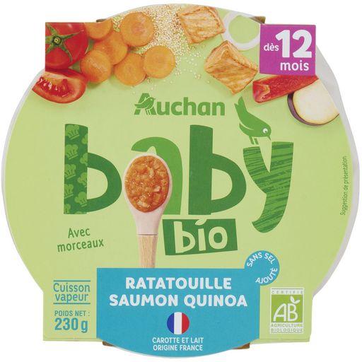 Aliment pour bébé - dès 12 mois - Purée à base de carotte, purée de tomate, saumon, quinoa, poivron rouge, aubergine, oignon et courgette bioFabrication et distribution certifiées par Ecocert FR-BIO-01