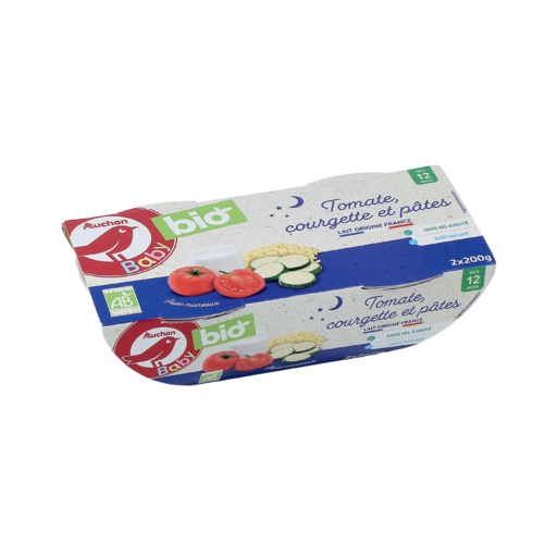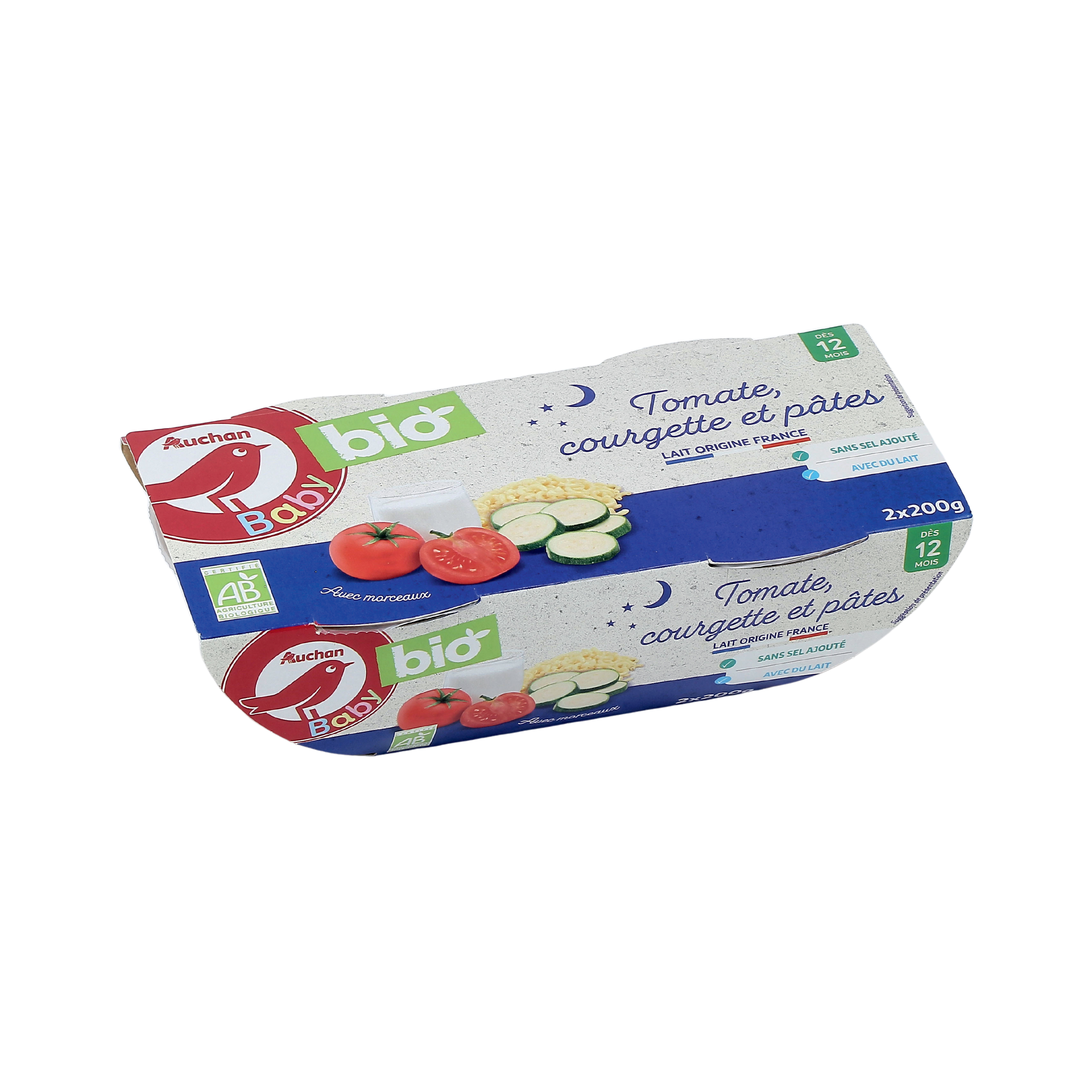 Aliment pour bébé - dès 12 mois - Purée à base de carotte, purée de tomate, courgette, pâtes et lait bioFabrication et distribution certifiées par Ecocert FR-BIO-01