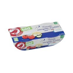 Ingrédients : Carotte* 26%, eau de cuisson, purée de tomate* 16%, courgette* 12%, pâtes cuites* (eau, semoule de blé dur*, poudre de blanc d' œuf *) 11,2%, oignon*, lait entier en poudre* (origine : France) 3,5%, crème* ( lait ), fécule de manioc*, basilic*, persil*, ail*, huile d'olive vierge*, origan*. *Issus de l'Agriculture Biologique
