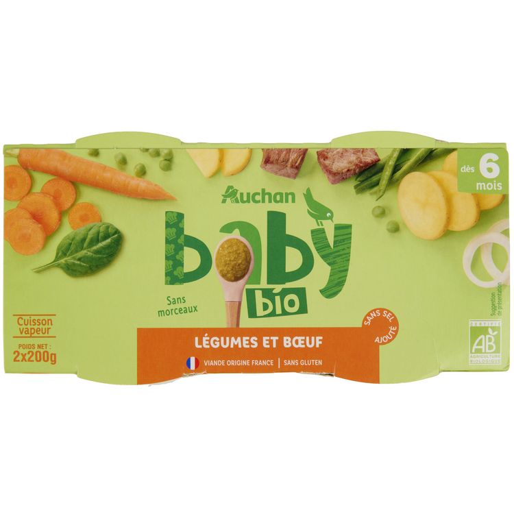 Ingrédients : Eau de cuisson, carotte* 20%, pomme de terre* 18%, haricot vert* 10%, viande de bœuf* (origine : France) 8%, petit pois* 8%, oignon* 6%, épinard* 5%, huile de tournesol*, huile de colza*, ail*. *Issus de l'Agriculture Biologique