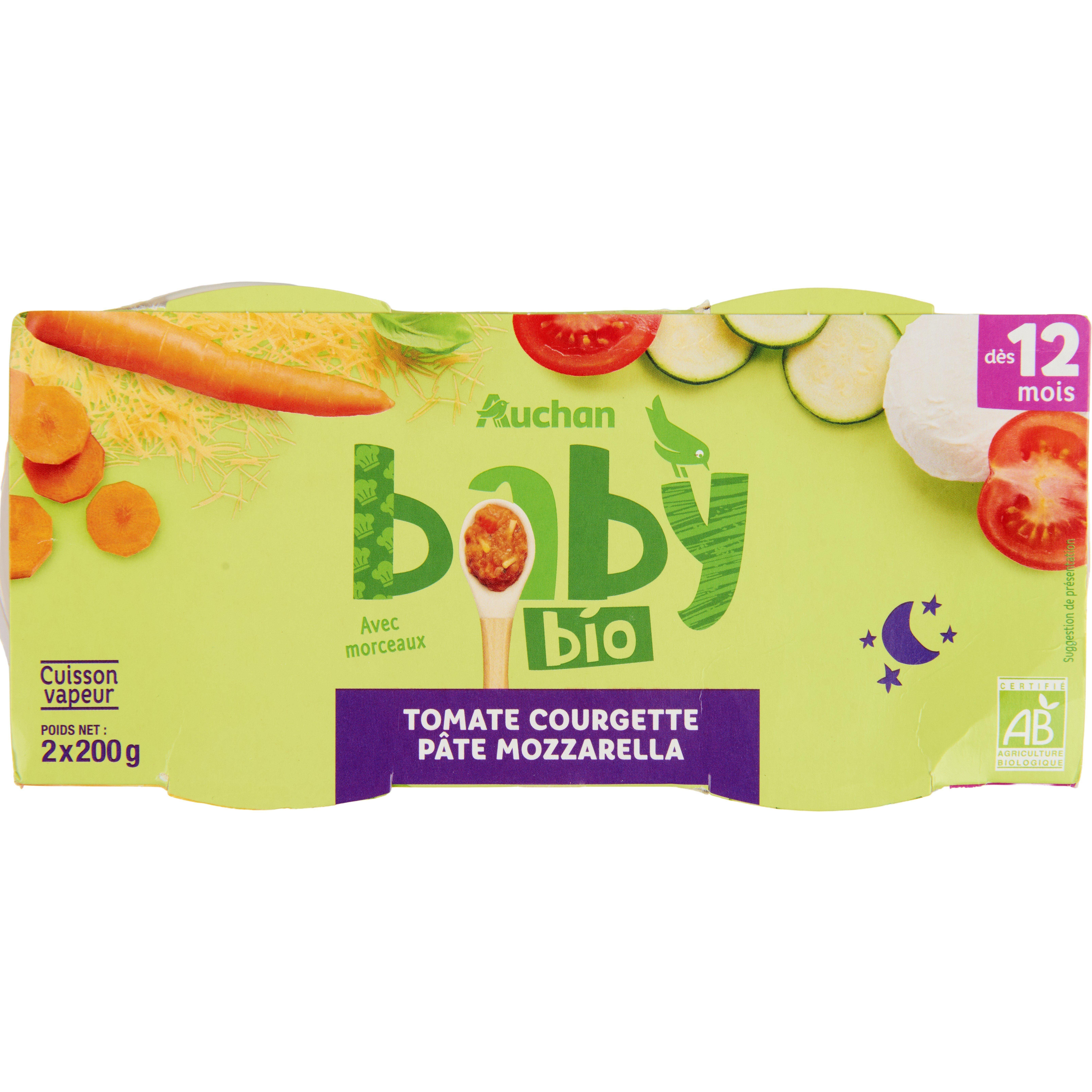 Aliment pour bébé - dès 12 mois - Purée à base de carotte, purée de tomate, courgette, pâtes et mozzarella bioFabrication et distribution certifiées par Ecocert FR-BIO-01