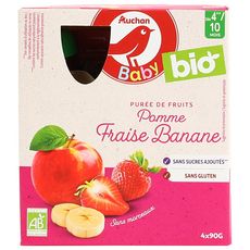 Aliment pour bébé à base de pomme, fraise et banane.Produit issu de l'Agriculture Biologique.