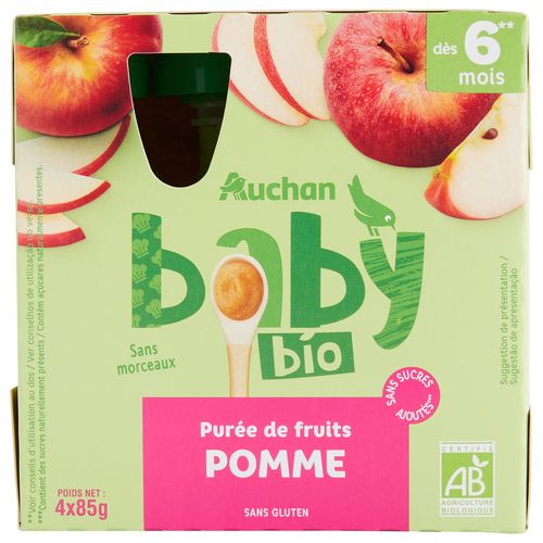 Aliment pour bébé à base de purée de pomme. Produit issu de l'agriculture biologique. A conserver dans un endroit sec et fraisLes recettes de la gamme AUCHAN BABY ont été élaborées en collaboration avec des professionnels de la nutrition infantile. Pour un goûter équilibré nous vous recommandons d'associer une gourde de purée de fruits Auchan baby à De 6 mois à 1 an : du lait maternel ou un dessert lacté de la gamme Auchan baby ou un biberon de lait de suite. Après 1 an : un biscuit de la gamme Auchan baby ou une tartine de pain et/ou soit du lait maternel, soit un dessert lacté de la gamme Auchan baby, soit un biberon de lait Auchan Baby croissance.