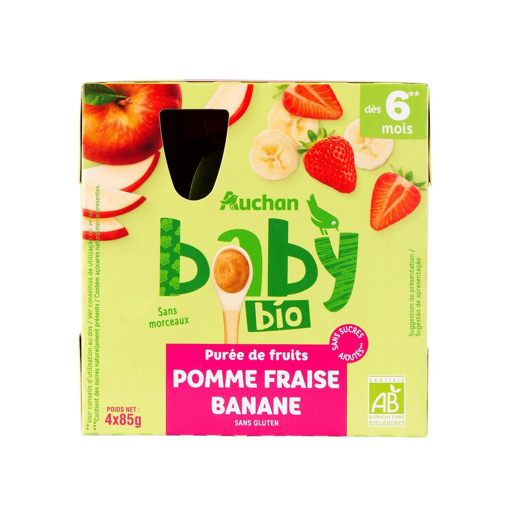 rAliment pour bébé à base de purée de pomme, fraise, banane. Produit issu de l'agriculture biologique. A conserver dans un endroit sec et fraisLes recettes de la gamme AUCHAN BABY ont été élaborées en collaboration avec des professionnels de la nutrition infantile. Pour un goûter équilibré nous vous recommandons d'associer une gourde de purée de fruits Auchan baby à De 6 mois à 1 an : du lait maternel ou un dessert lacté de la gamme Auchan baby ou un biberon de lait de suite. Après 1 an : un biscuit de la gamme Auchan baby ou une tartine de pain et/ou soit du lait maternel, soit un dessert lacté de la gamme Auchan baby, soit un biberon de lait Auchan Baby croissance.