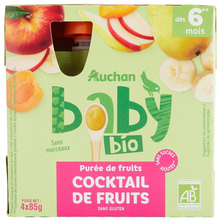 Aliment pour bébé à base de purée de pomme, poire, banane et abricot. Produit issu de l'agriculture biologique. A conserver dans un endroit sec et fraisLes recettes de la gamme AUCHAN BABY ont été élaborées en collaboration avec des professionnels de la nutrition infantile. Pour un goûter équilibré nous vous recommandons d'associer une gourde de purée de fruits Auchan baby à De 6 mois à 1 an : du lait maternel ou un dessert lacté de la gamme Auchan baby ou un biberon de lait de suite. Après 1 an : un biscuit de la gamme Auchan baby ou une tartine de pain et/ou soit du lait maternel, soit un dessert lacté de la gamme Auchan baby, soit un biberon de lait Auchan Baby croissance.