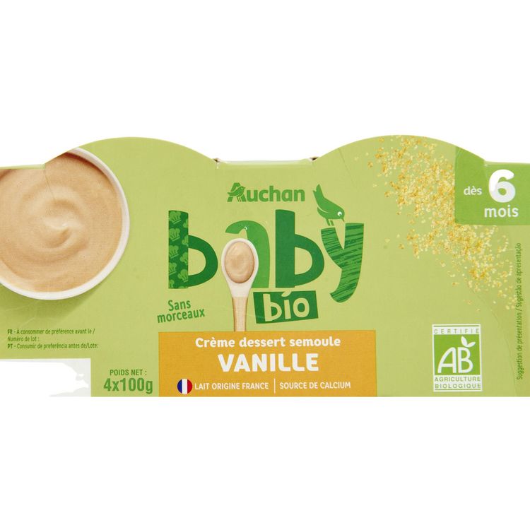 Dessert lacté semoule saveur vanille- Aliment adapté à l'enfantFabrication certifiée par Bureau Veritas FR-BIO-10. Distribution certifiée par Ecocert FR-BIO-01
