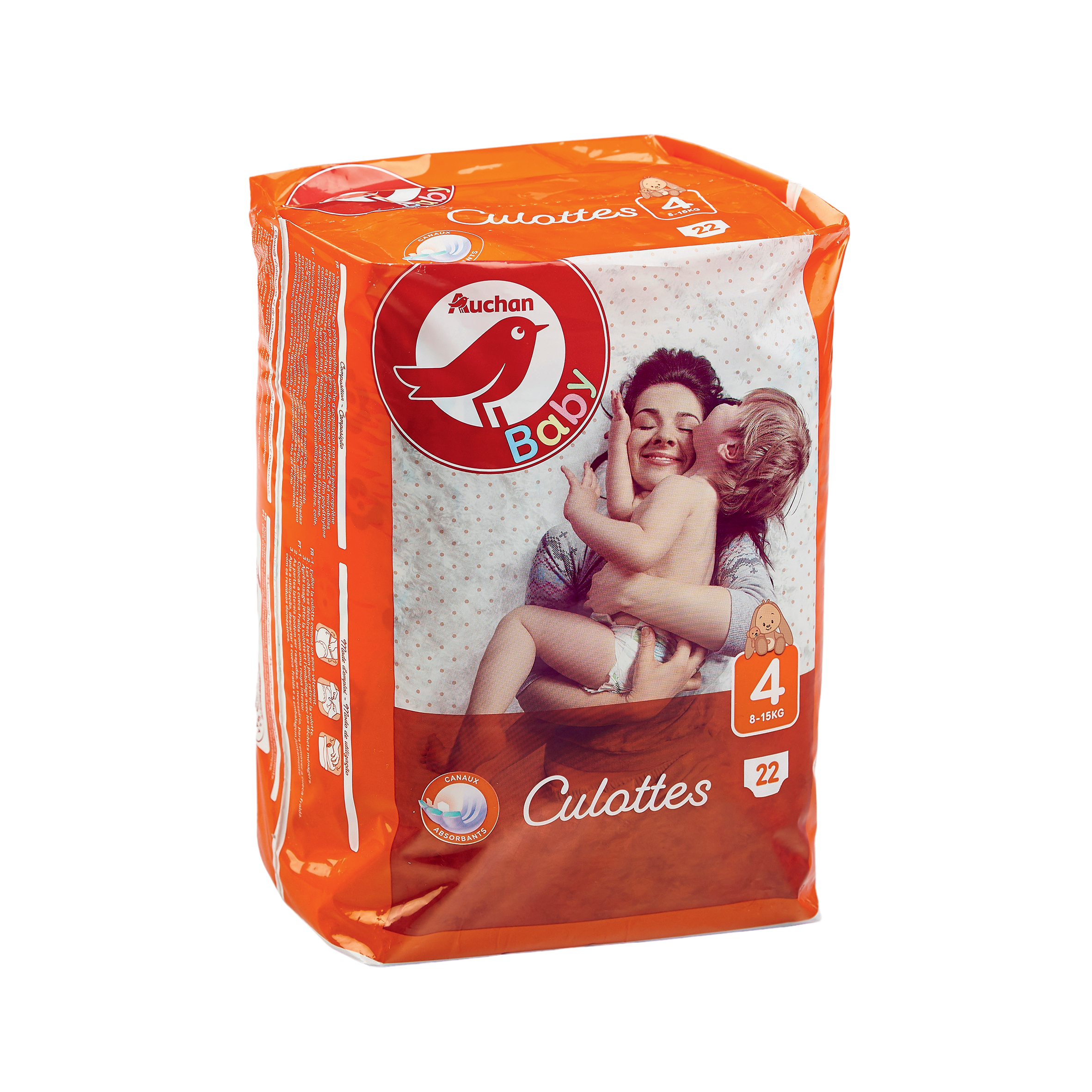Voile de surface polypropylène, couche d'acquisition non tissé polypropylène polyéthylène, corps absorbant fibres de cellulose certifiées FSC® et microbilles superabsorbantes polyacrylate de sodium, enveloppe extérieure film polyéthylène et polypropylène, barrières anti-fuites polypropylène, élastiques élasthanne, ceinture non tissé polypropylène, languette de refermabilité polyéthylène, colle, encres pour le décor.