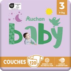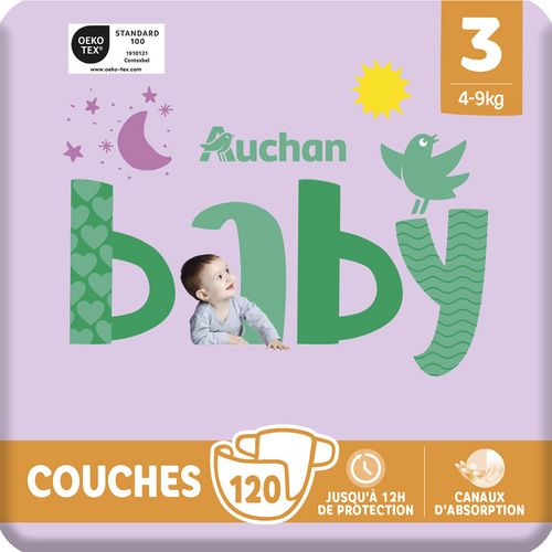 Les couches Auchan Baby assurent confort et protection pour Bébé. Elles associent finesse et douceur pour suivre ses mouvements et possèdent des canaux pour une absorption optimale. Bébé peut grandir en toute sécurité. Ultra douxCanaux d'absorptionBarrières anti-fuitesToucher ultra secAttaches repositionnablesVoile de surface testé dermatologiquementLes sachets à l'intérieur contiennent au moins 30% de plastique recycléJusqu'à 12h de protection0% parfum, lotion, colorant en contact avec la peau