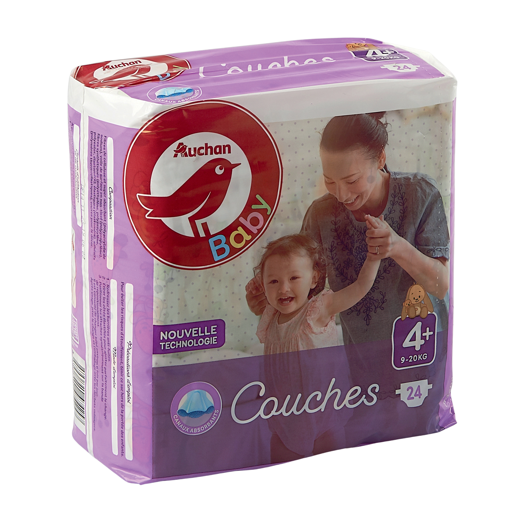 Adoptez les couches Auchan Baby qui faciliteront le quotidien de Papa et Maman de la taille 3 à la taille 6. Grâce à leurs canaux d’absorption et à leurs barrières anti-fuites, le liquide est parfaitement réparti dans la couche, pour une peau de bébé protégée et maintenue au sec de jour comme de nuit, et ce jusqu’à 12h. Fines, flexibles et dotées de leur voile ultra-doux, les couches procurent une sensation de confort optimale pour bébé qui est libre de ses mouvements.Et parce que nous souhaitons prendre soin de la peau de bébé, nous avons décidé de créer des couches sans parfum, ni lotion qui sont testées dermatologiquement.Les couches Auchan Baby ne font pas l’impasse sur le style de bébé en affichant des motifs tout doux.La taille 4+ présente les mêmes dimensions que la taille 4, mais offre une plus grande qualité d’absorption pour les bébés qui ont des besoins plus importants : idéal pour les protéger des fuites et pour garder leur peau au sec.