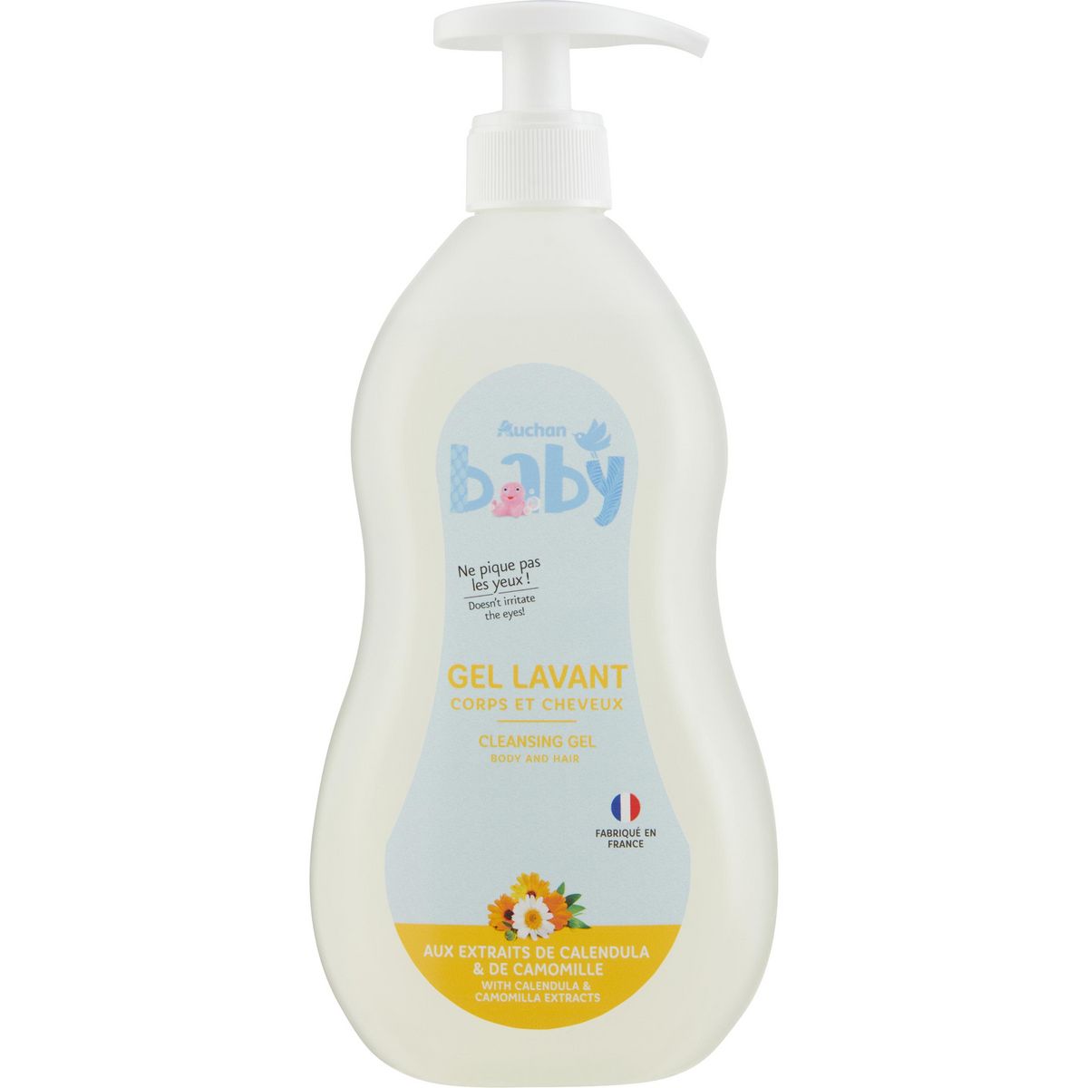 aux extraits de calendula et de camomille.Ne pique pas les yeuxGel lavant corps et cheveuxbébéTolérance testée sous contrôle dermatologiqueFabriqué en France